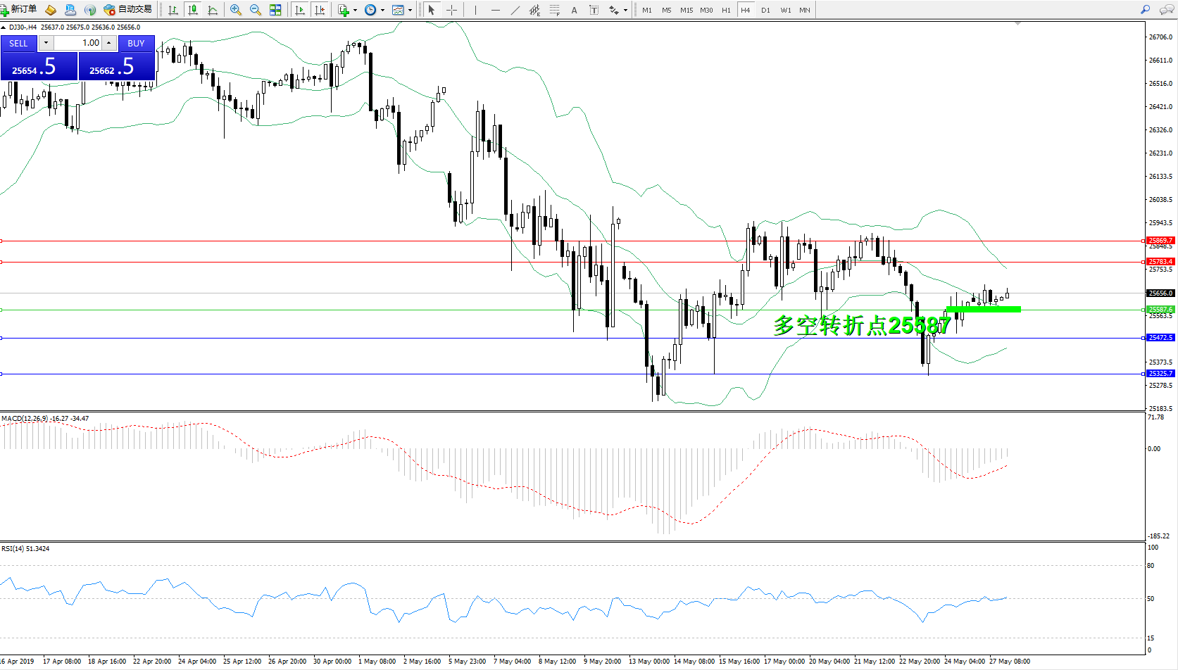 道琼斯指数DJ30—— 4小时K线图显示: