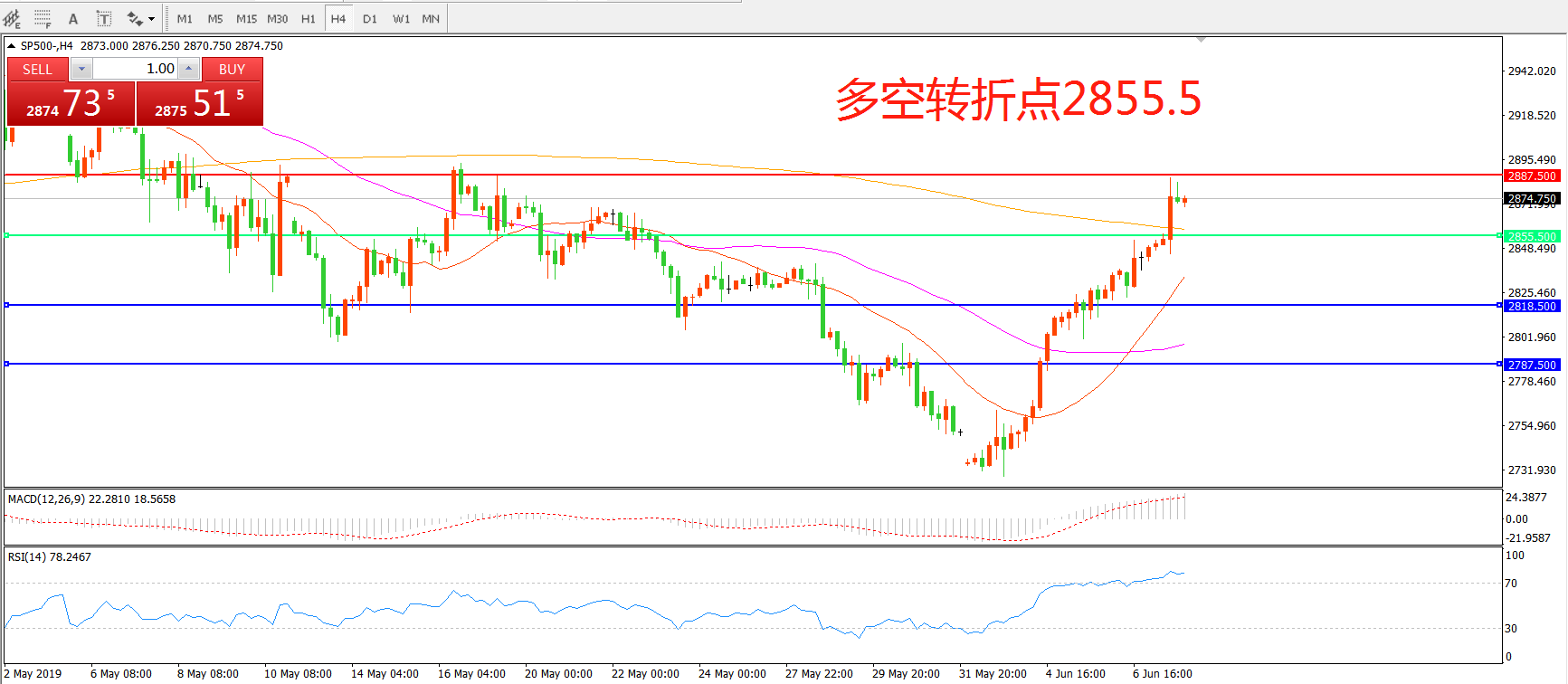 本周五公布的美国非农就业报告 显示,今年5月仅新增7.5万就业者,不到市场预期17.5万人的一半,新增就业人数远逊预期的报告掀起了市场预期美联储会迅速转向宽松的高潮。市场对美联储降息的预期大增。此外,美国总统特朗普宣布,目前已经与墨西哥达成贸易协议,消息面的利好提振了股市,标普涨1.05%,收报2874.75点。