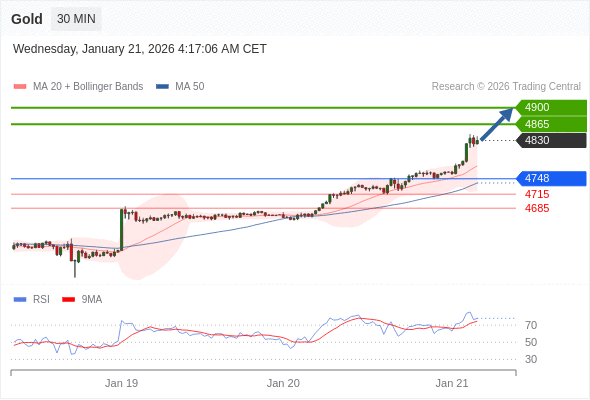 在 4748 之上,看涨,目标价位为 4865 ,然后为 4900 。