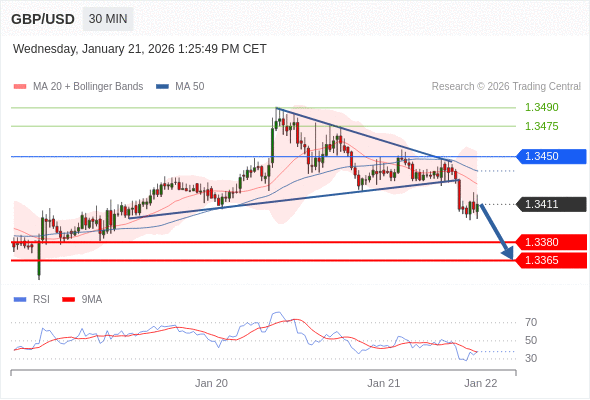 在 1.3450 之下,看跌,目标价位为 1.3380 ,然后为 1.3365 。