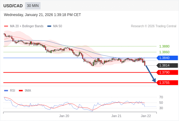 在 1.3840 之下,看跌,目标价位为 1.3790 ,然后为 1.3755 。