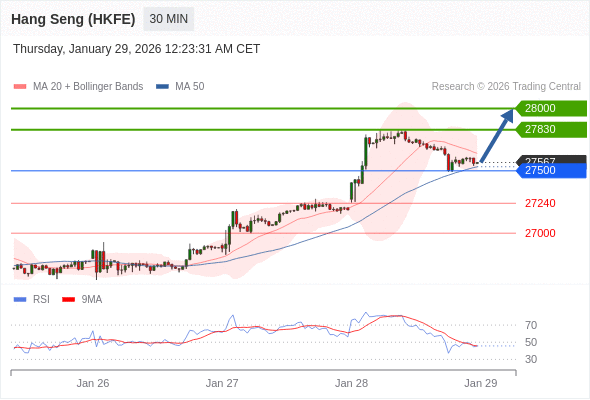 在 27500 之上,看涨,目标价位为 27830 ,然后为 28000 。
