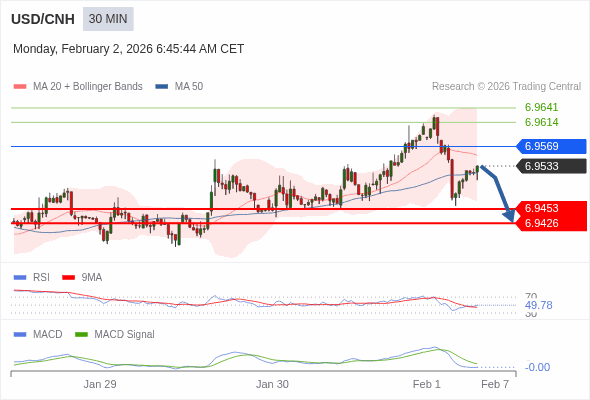交易策略: 当 6.9569 维持阻力位时,看跌,目标锁定在 6.9426 。