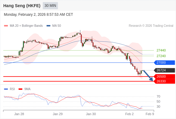 香港恒生指数期货 当日内: 短期关键阻力位在27000。