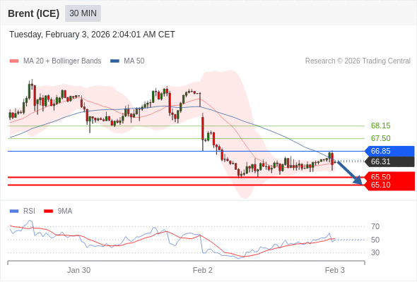 在 66.85 之下,看跌,目标价位为 65.50 ,然后为 65.10 。