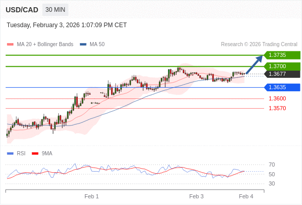 在 1.3635 之上,看涨,目标价位为 1.3700 ,然后为 1.3735 。
