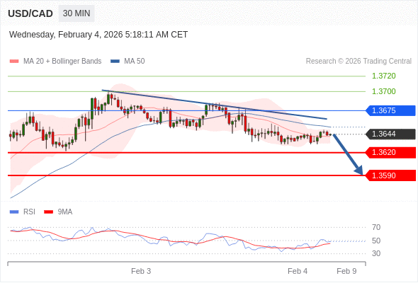 在 1.3675 之下,看跌,目标价位为 1.3620 ,然后为 1.3590 。