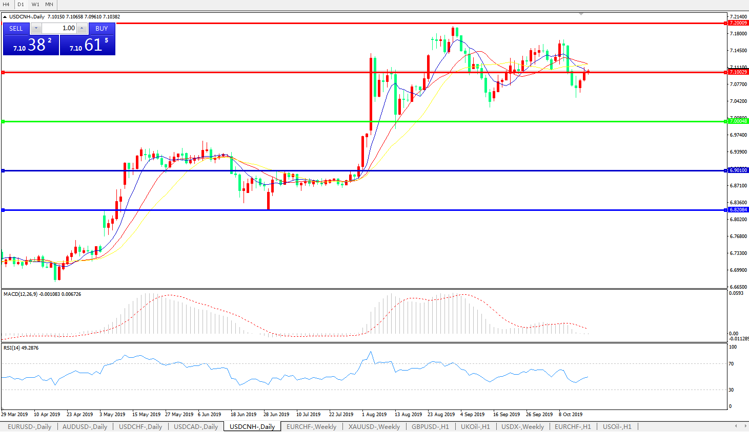 技术面简析:日图短期均线呈空头排列,汇价7.10关口窄幅整理,MACD快速逼近0轴且量能快速缩量,RSI小幅走升,预计短期汇价将延续宽幅整理态势,汇价运行于7.00-7.15区间的概率较大;中美贸易后续谈判进展将决定汇价最终趋势。