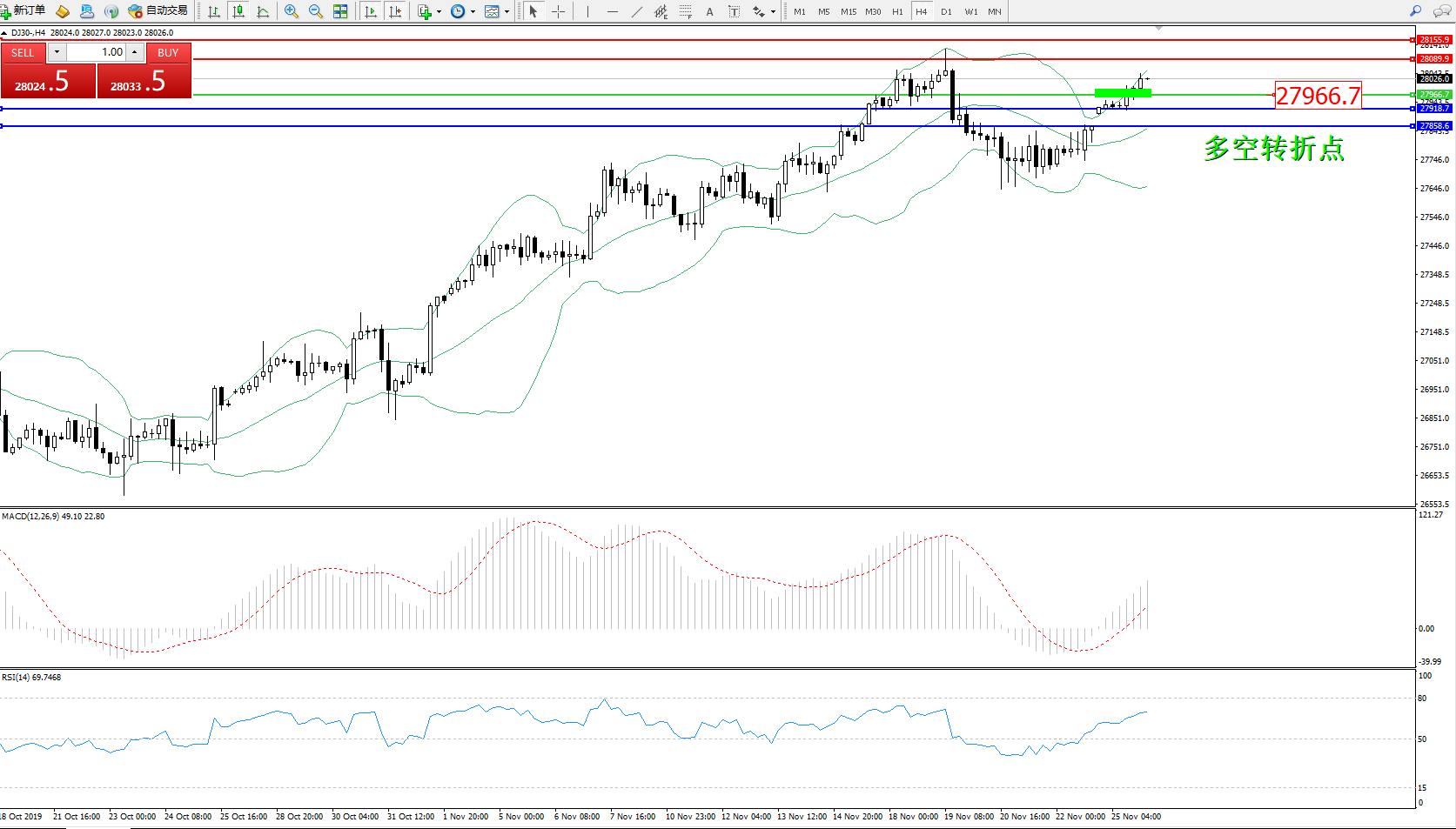 道琼斯指数DJ30—— 4小时K线图显示: