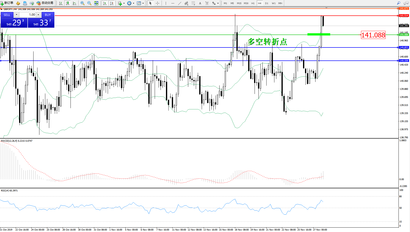 交易策略:141.088上方看涨,目标141.514141.673