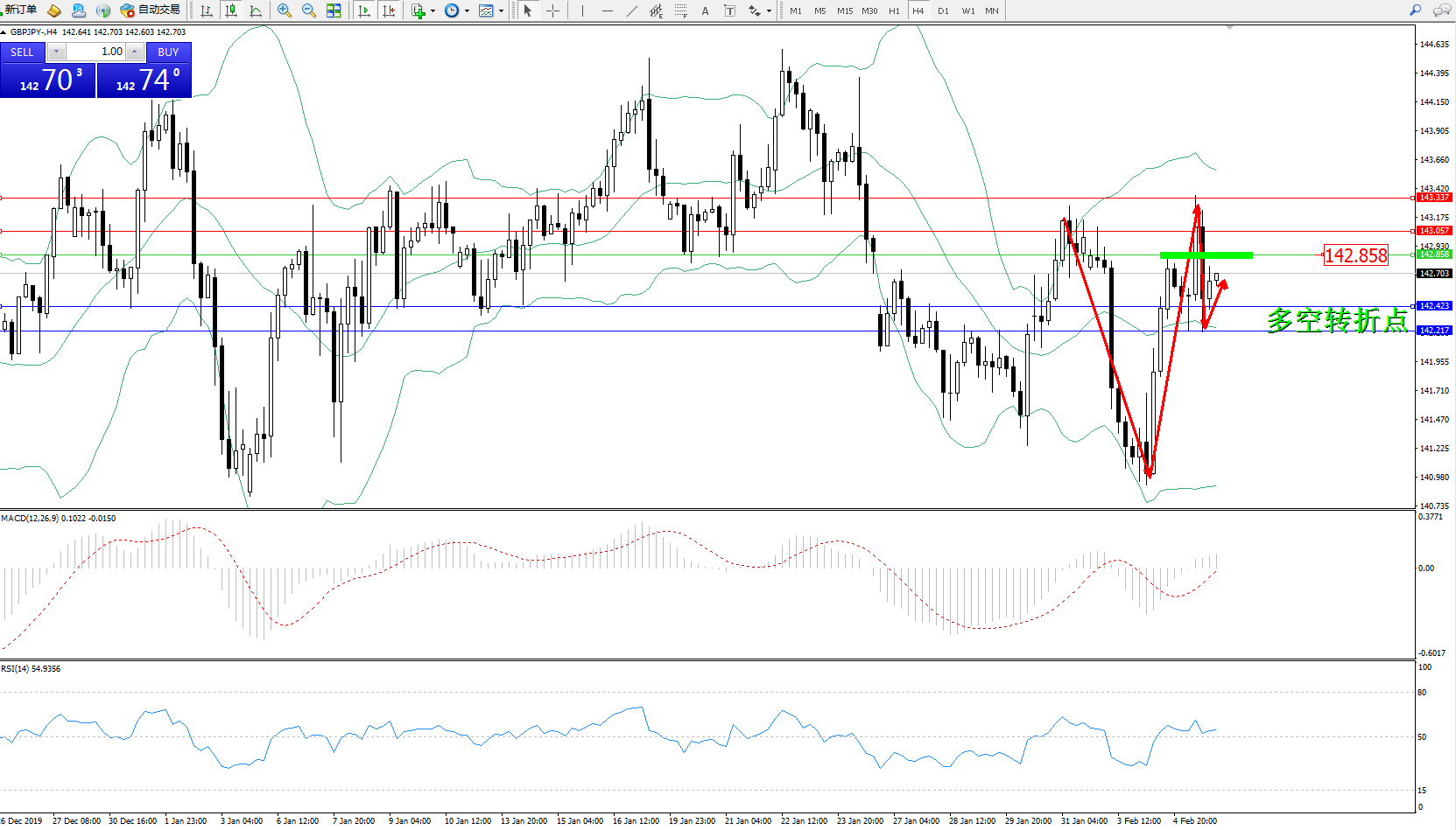 交易策略:142.858下方看跌,目标142.423142.217