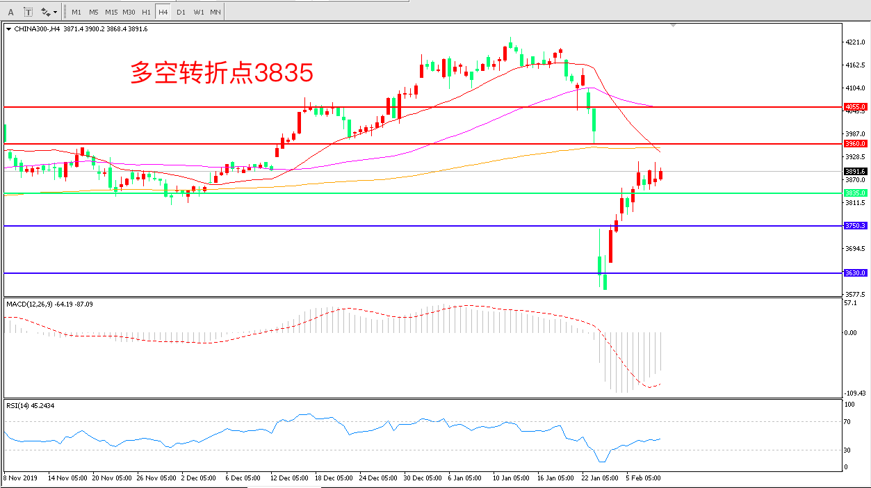 4小时图看,沪深300阳线连续拉升,整体表现强势,3835一线成为支撑,均线系统走平,MACD绿柱缩短,RSI指标走平,日内延续上行概率较大。