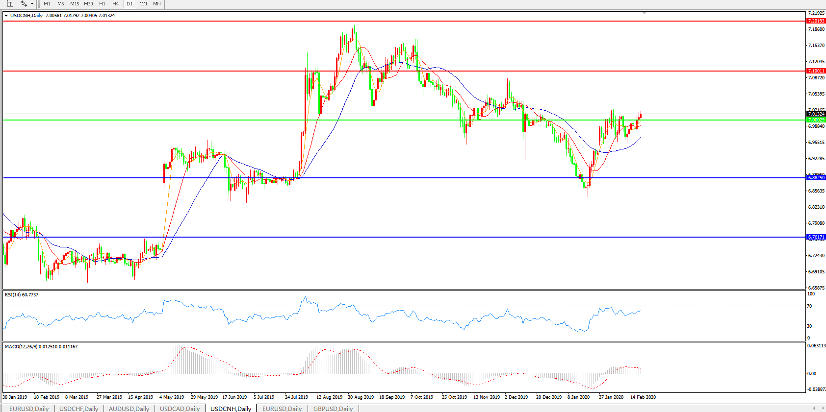技术面简析:日图均线整体呈多头排列,汇价暂时企稳7.0关口,MACD运行于0轴上方但量能不足,RSI震荡偏强,预计汇价短期或将围绕7.0关口整理。