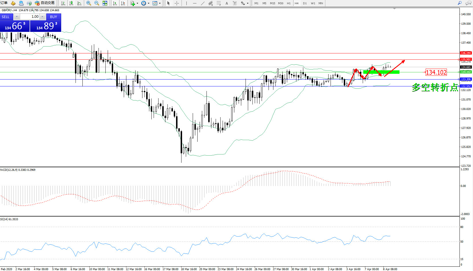交易策略:134.102上方看涨,目标135.502136.194