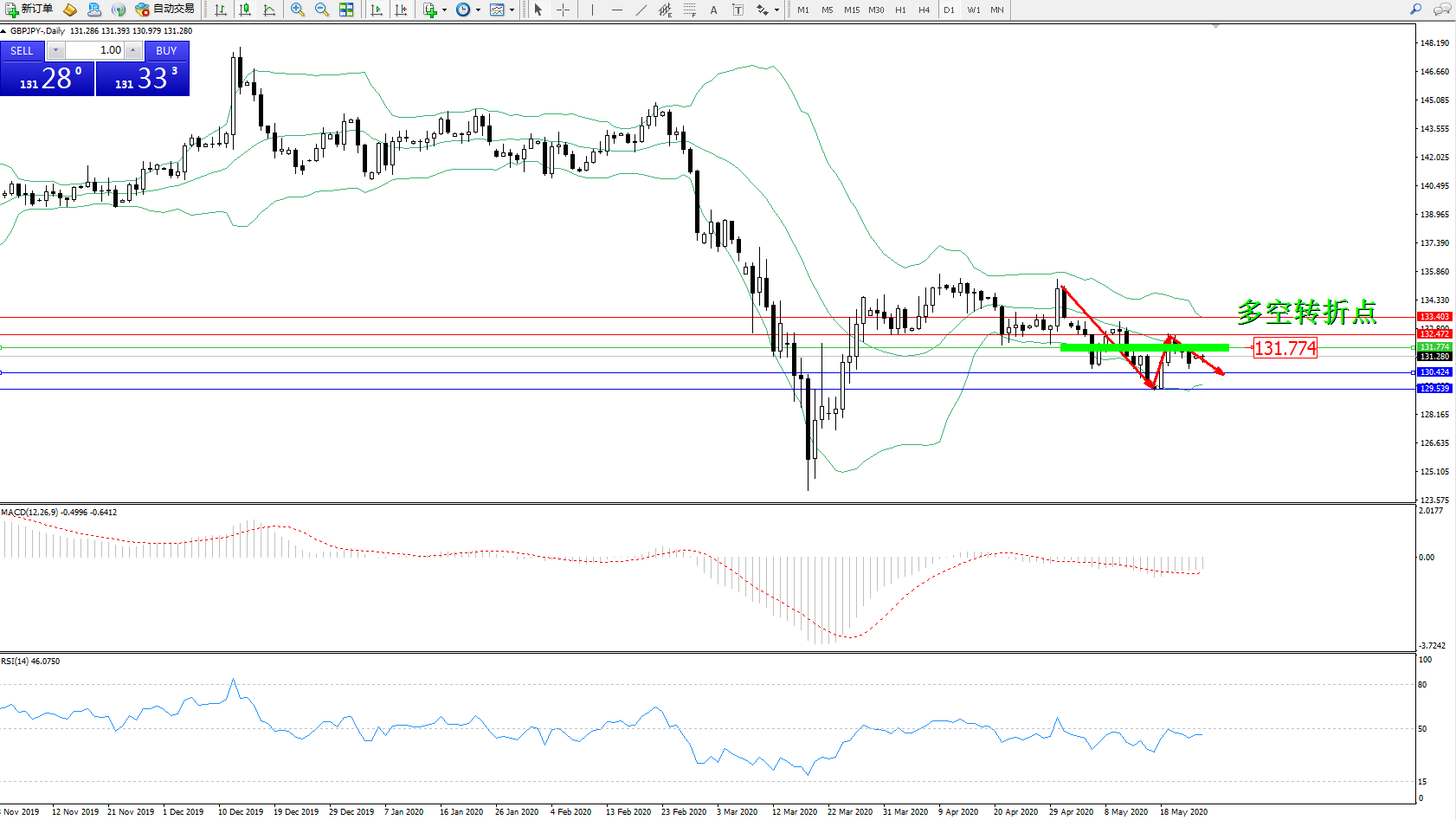 交易策略:131.774下方看跌,目标130.424、129.539