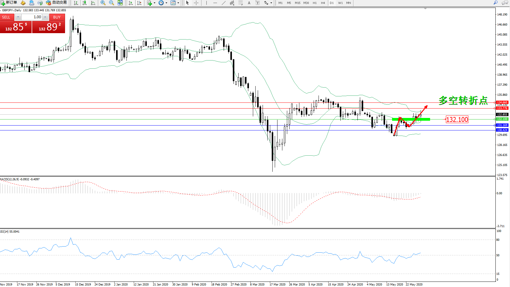 交易策略:132.100上方看涨,目标133.776、134.660