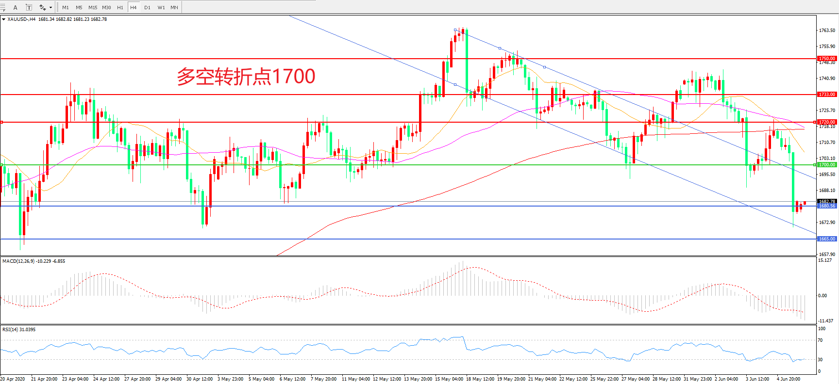 交易策略: 在1700.00之下看跌,目标1680.00   1665.00