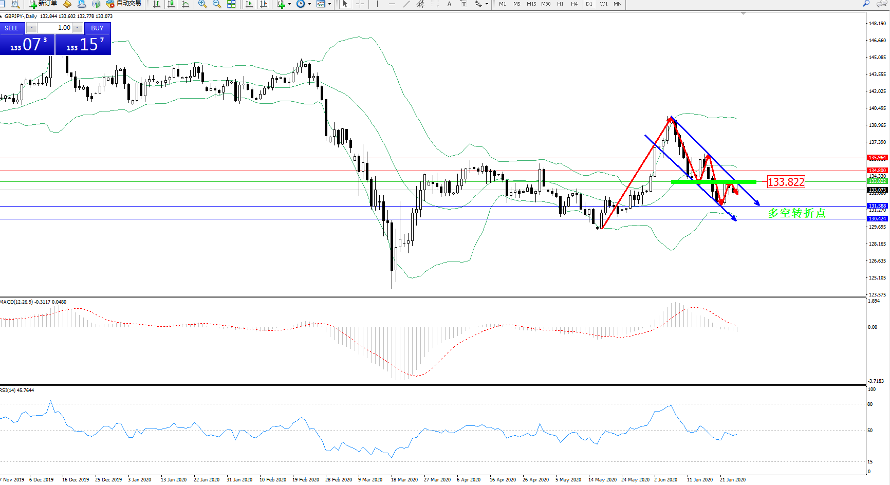 交易策略:133.822下方看跌,目标131.588、130.424