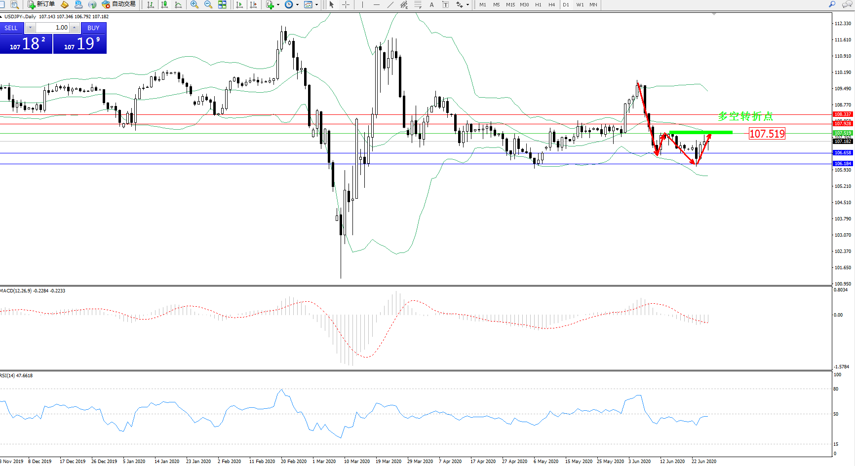交易策略:107.519下方看跌,目标 106.658、106.184