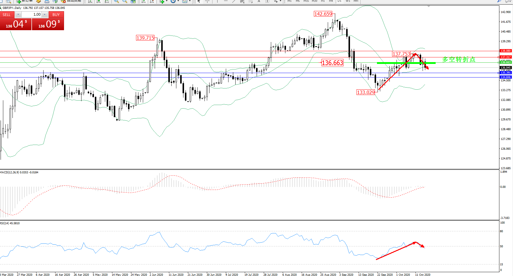 交易策略:136.663下方看跌,目标135.391、134.846