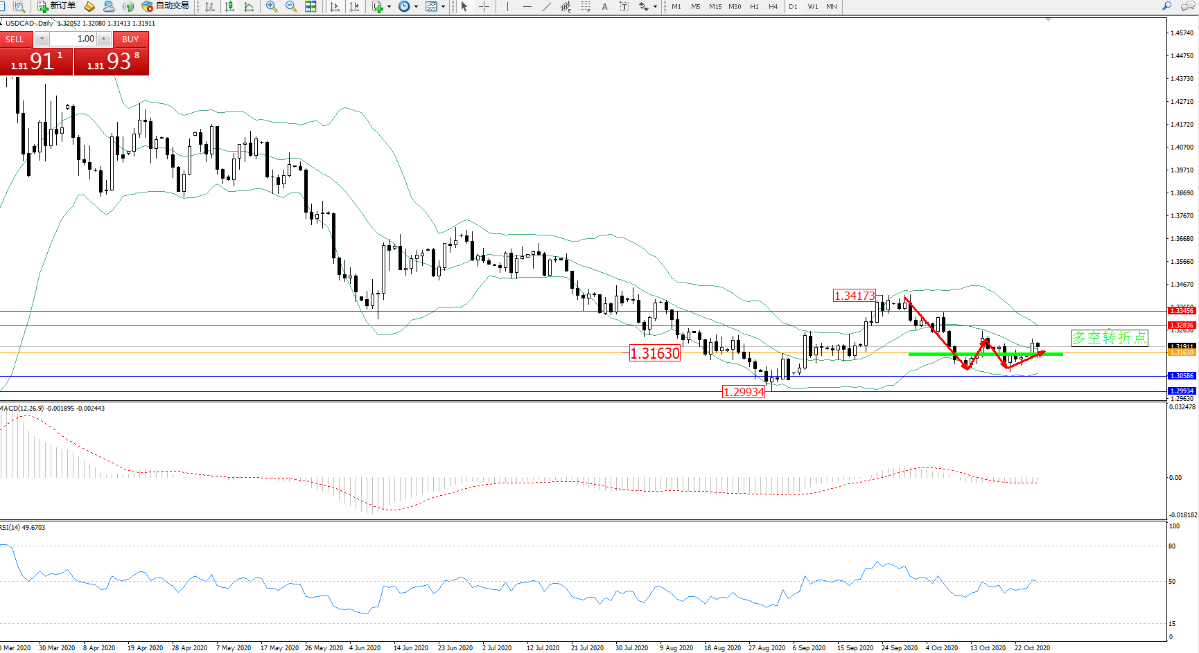 美元加元USDCAD——日K线图显示: