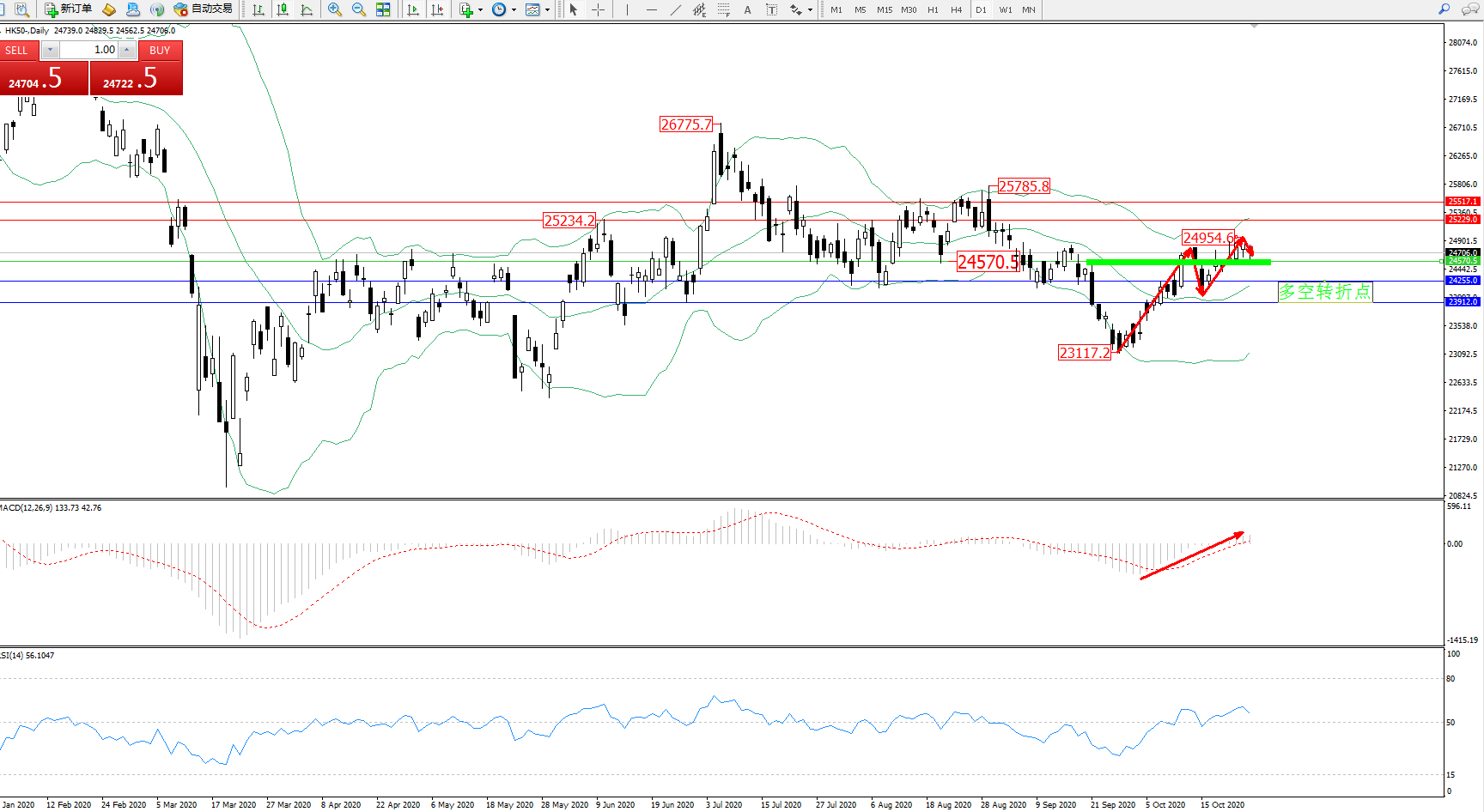 香港恒生指数10月27日(周二)收盘下跌131.59点,跌幅0.53%,报24787.19点;港股指数走势分化,大型科技股强势,恒生科技指数收涨0.84%。特斯拉概念、双十一概念股全天强势,电池股午后拉升明显,比亚迪股份涨4%;半导体、家电股小幅走强;大型科技股腾讯大涨4.19%创历史新高,市值高达5.6万亿港元,中芯国际、美团、阿里均上涨,小米跌3.4%;今日南下资金大幅净流入72.49亿港元,大市成交额为1305.2亿港元。香港:9月出口年率为9.1%,预期0.2%,前值-2.3%;9月进口年率3.4%,预期-1.9%,前值-5.7%;9月贸易帐为-127亿港元,预期-221亿港元,前值-146亿港元。据香港经济日报,蚂蚁孖展认购火热进行,首日已突破1000亿。蚂蚁港股孖展认购首日已突破1400亿,超额认购约42倍。