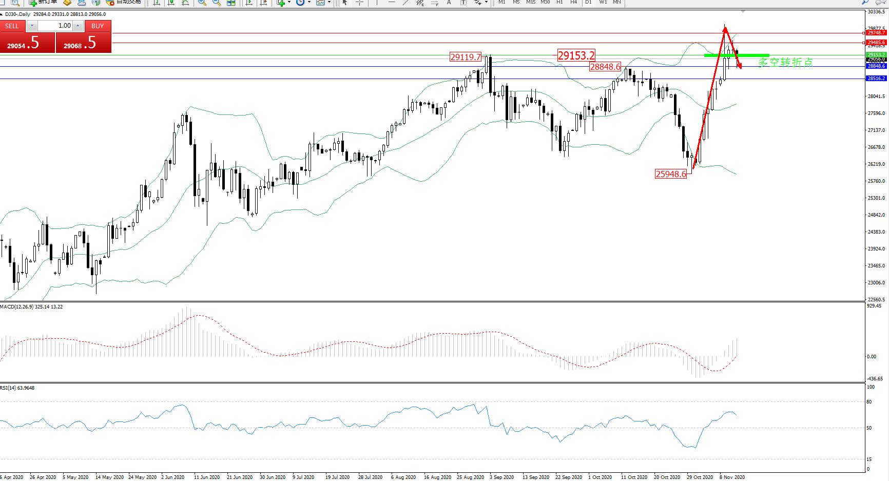 备选策略:29153上方看涨,目标29485、29748