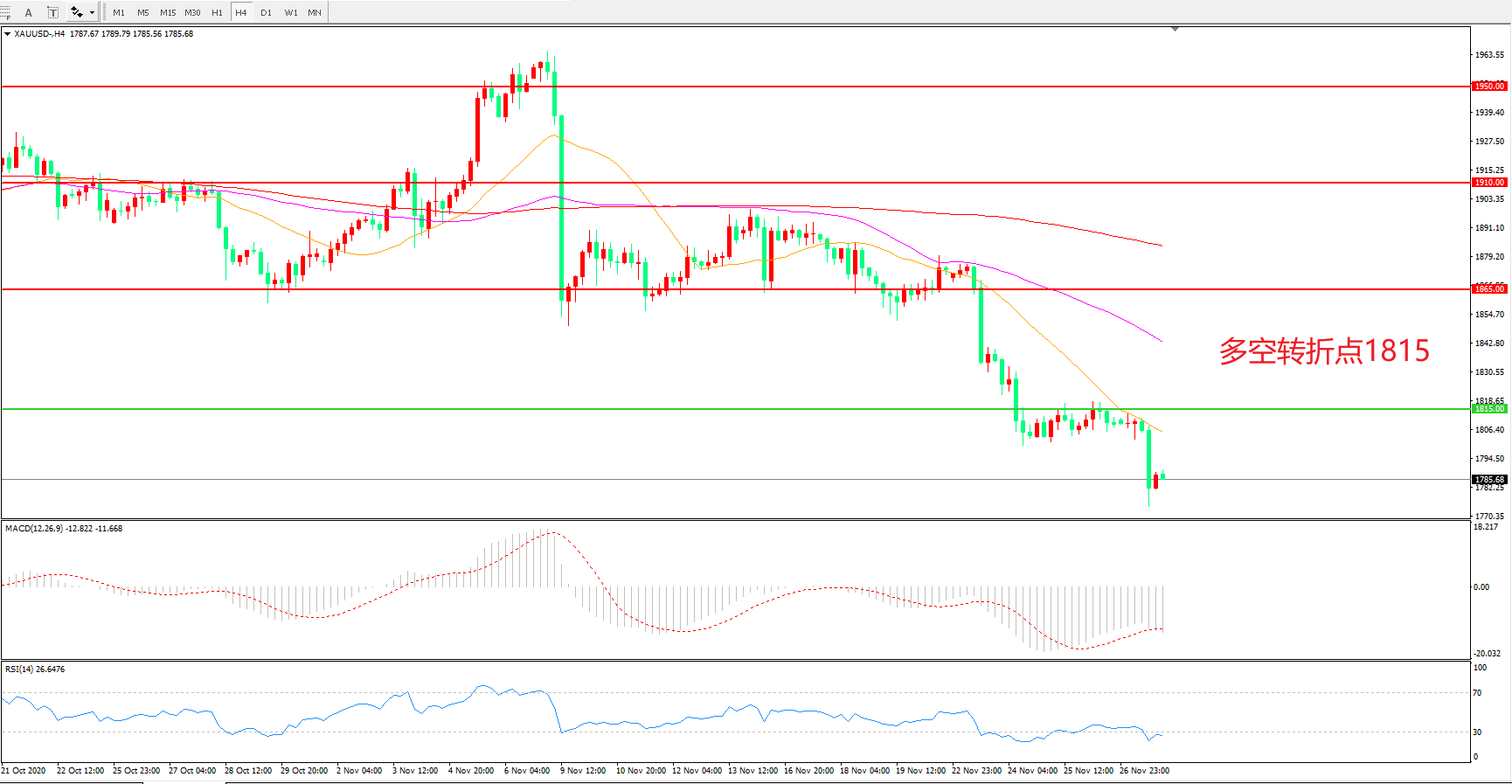 上周,市场避险情绪显著退潮,现货黄金遭遇7月以来的最大“滑铁卢”,金价破位下跌,并失守1800美元重要关口支撑,创下7月7日以来新低,最终至1787.27美元/盎司,创下9月25日以来当周以来最大周阴线。感恩节假期造成的流动性稀疏,放大了市场波动空间。