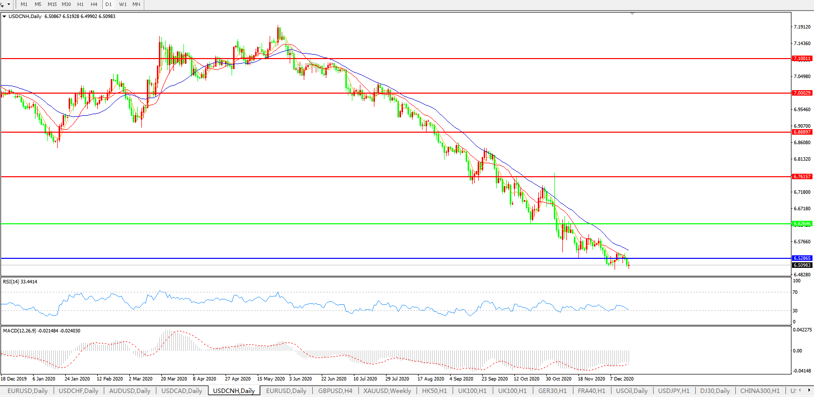 美元兑人民币USDCNH 日线图: