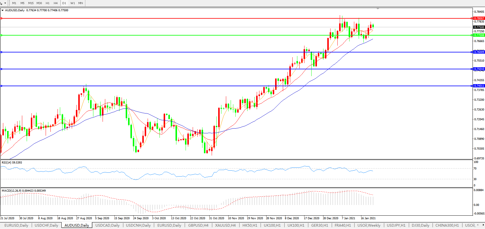 交易策略:0.7700上方看涨,目标0.7800、0.7900