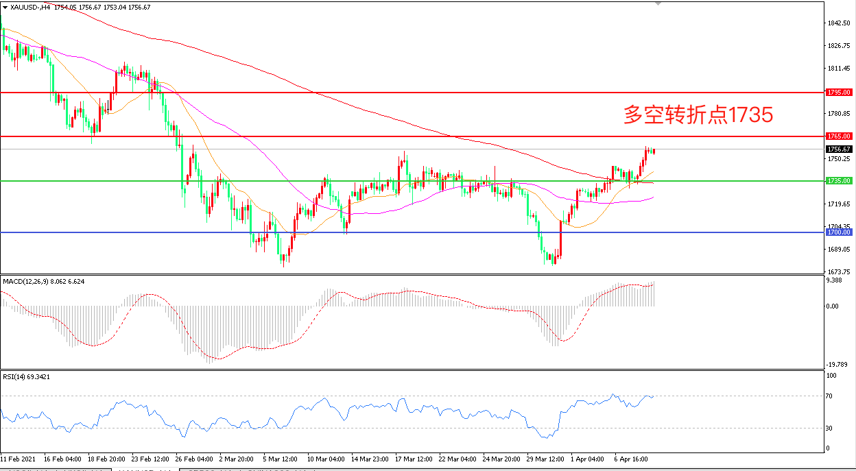 周四(4月8日),虽然美国初请失业金人数意外不降反增,但美联储再次释放宽松信号,美联储主席鲍威尔称,全球新冠疫苗接种发展不均威胁到经济复苏,通胀料将暂时上行。受此影响,美债收益率回落,美元下行提振金价表现,现货黄金大涨逾20美金,收报1754.09美元/盎司。