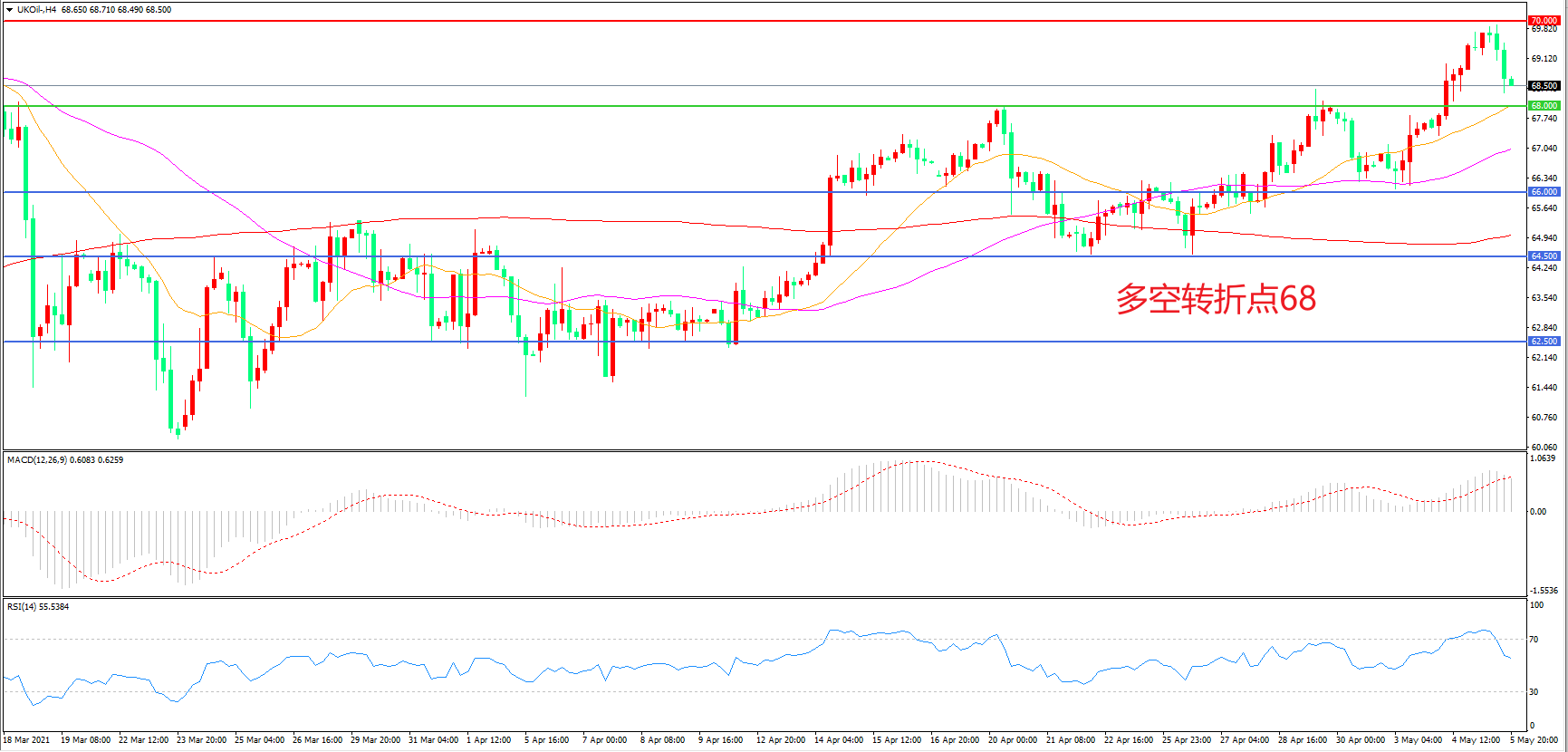 周三(5月5日),美国当周EIA原油库存减少799万桶,远超市场预期,但疫情反复造成的需求前景担忧依然让多头迟迟不敢发起向上的冲击,布伦特原油先涨后跌,收报68.50美元/桶。近期印度新冠疫情感染和死亡人数持续以惊人速度增加,连续13天单日新增病例超过30万例,作为世界第三大原油消费国,印度疫情的严峻形势给油价带来了一定压力。