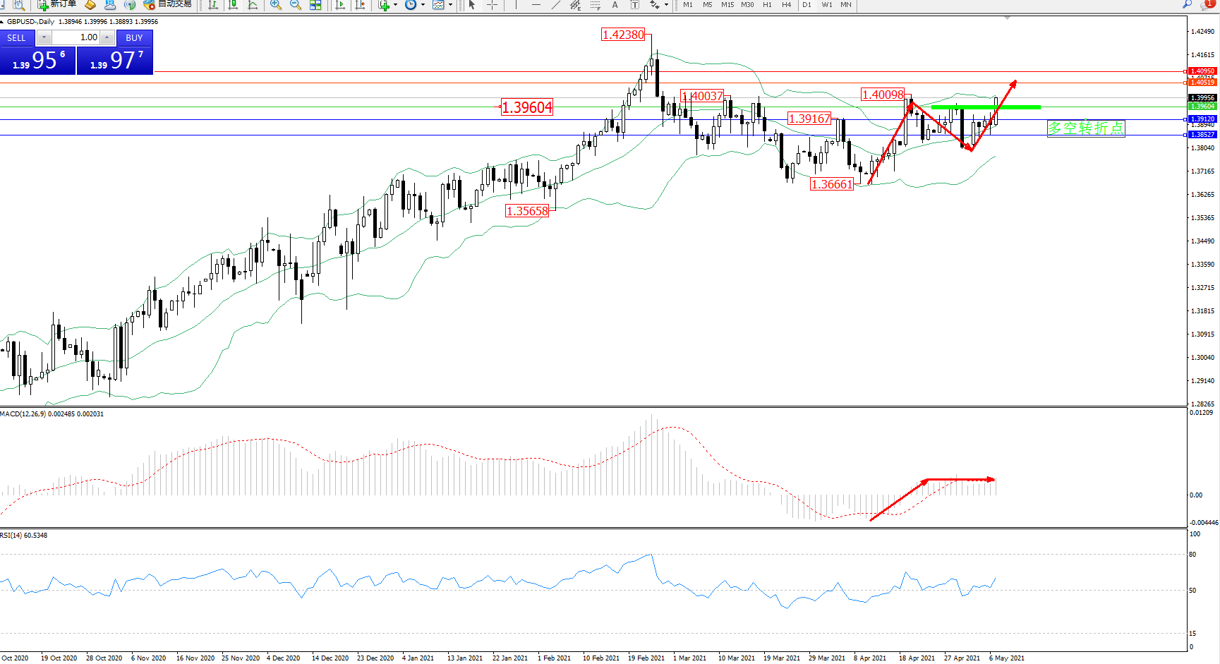 交易策略:1.39604上方看涨,目标1.40519、1.40950