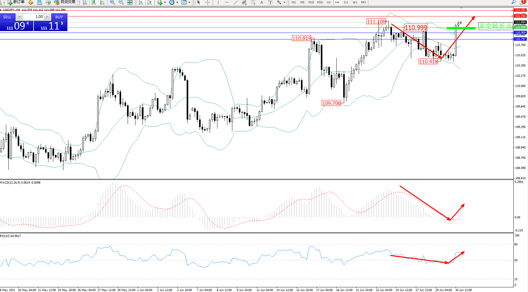 交易策略:110.999上方看涨,目标111.195、111.292