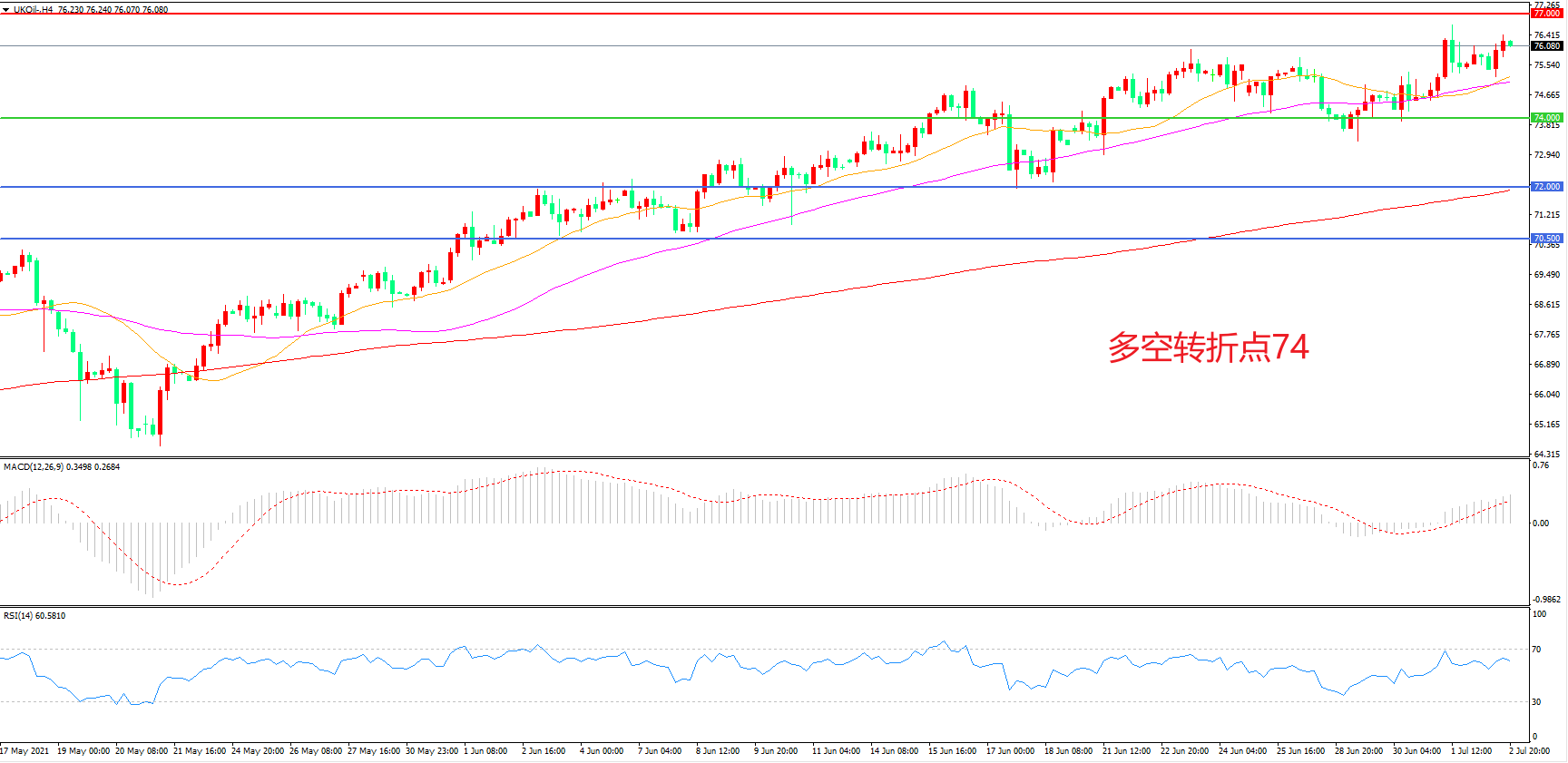 交易策略:在74.00之上看涨,目标77.00 80.00