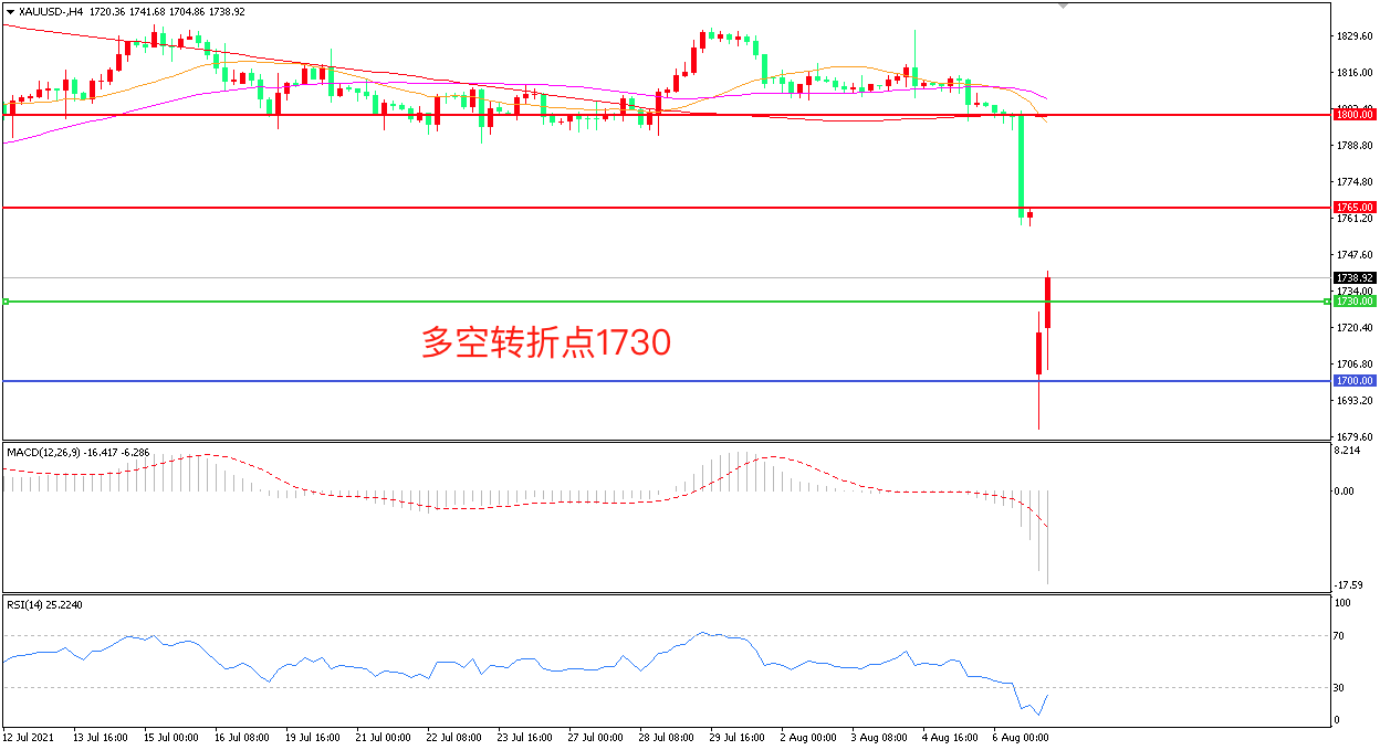 4小时图看,金价长阴下破后跳空低开,整体表现极度低迷,1730成为多空分水岭,1700成为短期支撑,MACD绿柱增加,RSI指标向下,日内重点关注是否有回补跳空缺口的迹象。