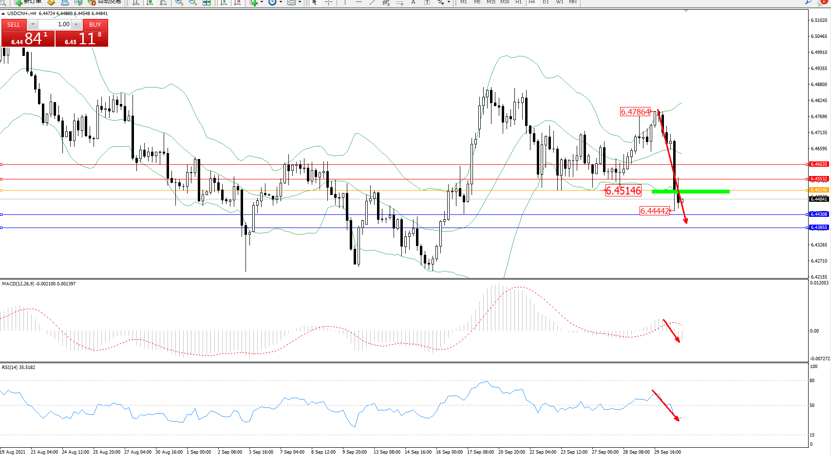 交易策略:6.45146下方看跌,目标6.44308、6.43855