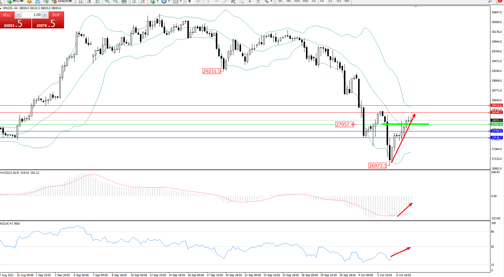 交易策略:27957上方看涨,目标28240、28410