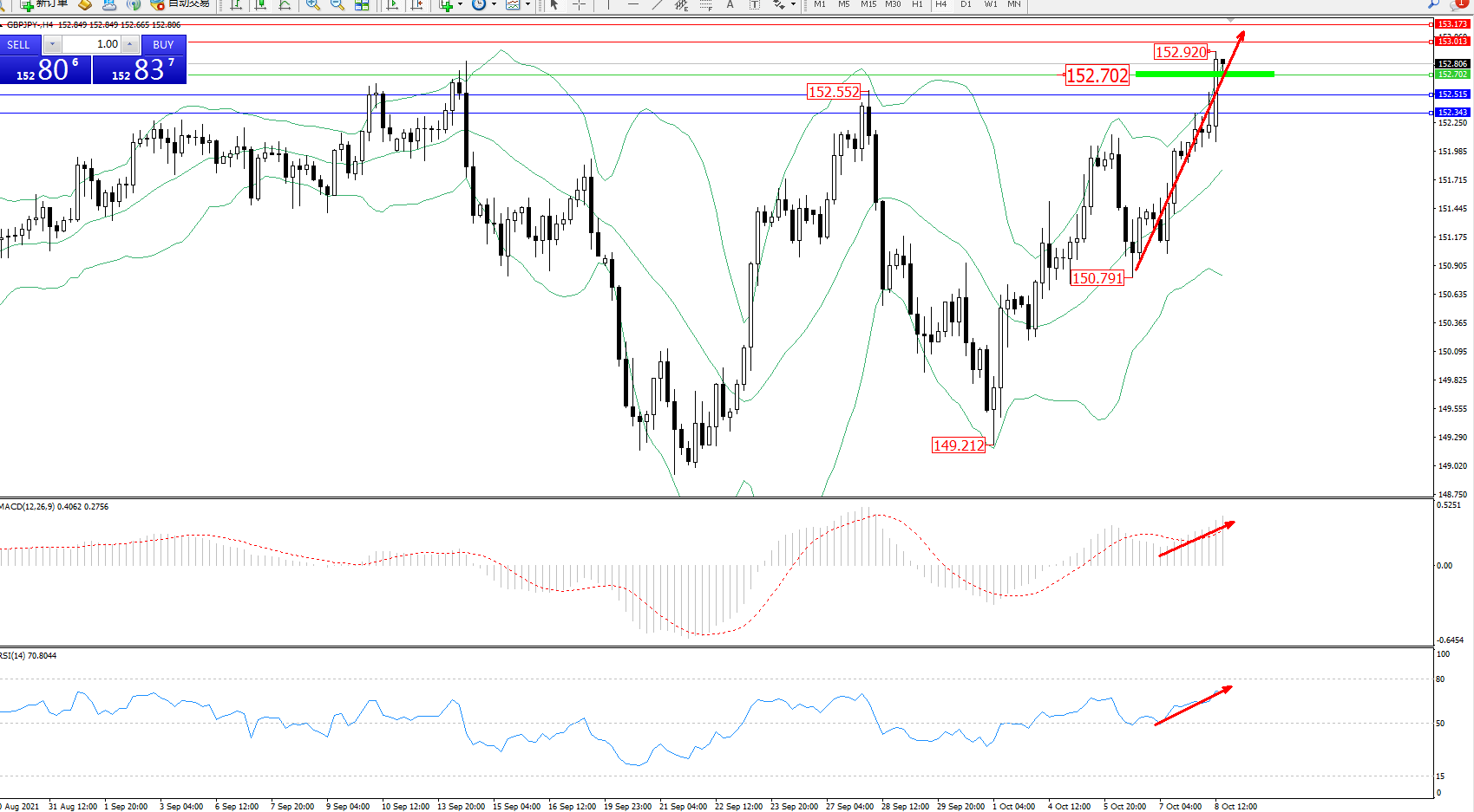 技术点评:多头动力延续布林带指标上轨附近持续震荡上扬,上方抵达152.920附近后得到压制开始整理,布林带指标呈上行趋势拉升后开始有缓慢张口迹象,MACD指标处于多头区域维持整理上移中,RSI指标处于多头区域维持震荡向上移动;