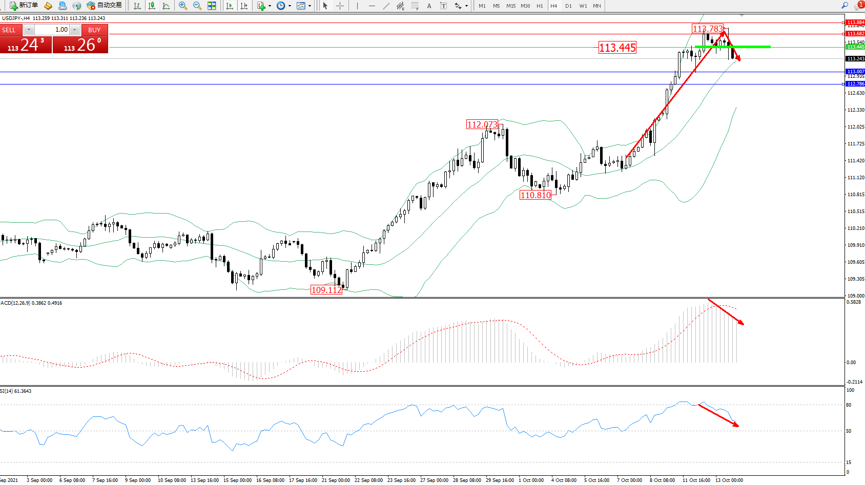 交易策略:113.445下方看跌,目标113.007、112.786