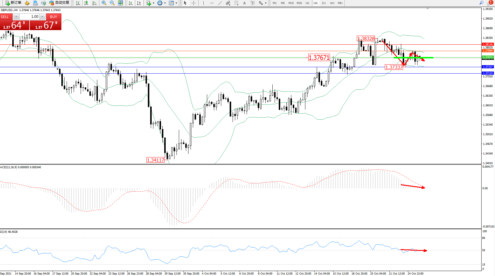 交易策略:1.37671下方看跌,目标1.37337、1.37115
