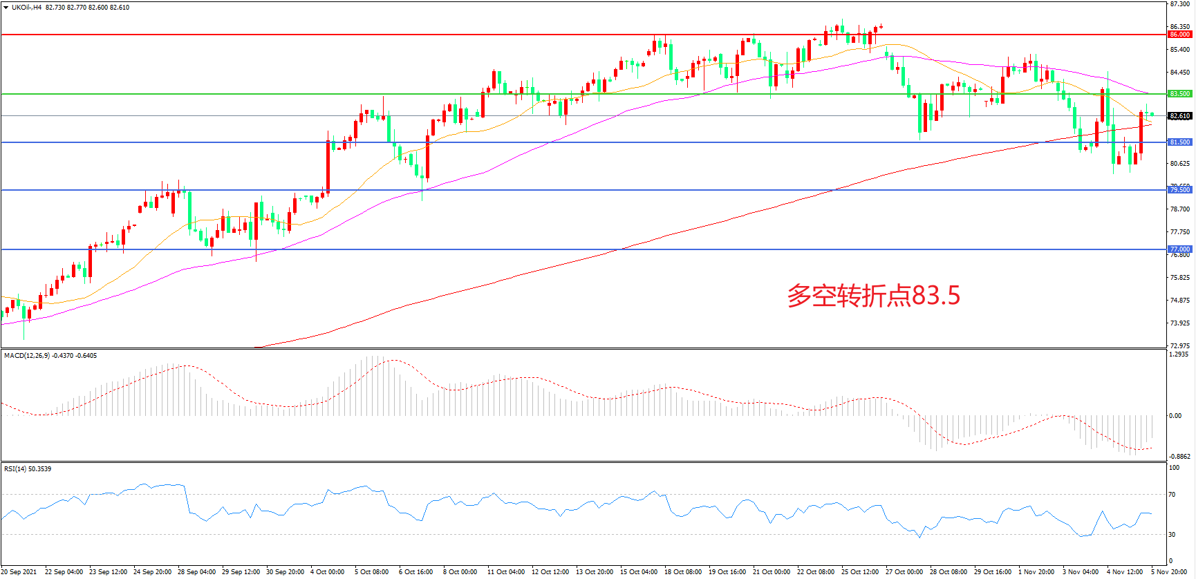 4小时图看,油价回踩81.5美元后再度拉升,短线走势有所回暖,83.5成为短期阻力,81.5美元成为下方支撑,MACD绿柱缩短,RSI指标走平,日内弱势震荡概率较大。