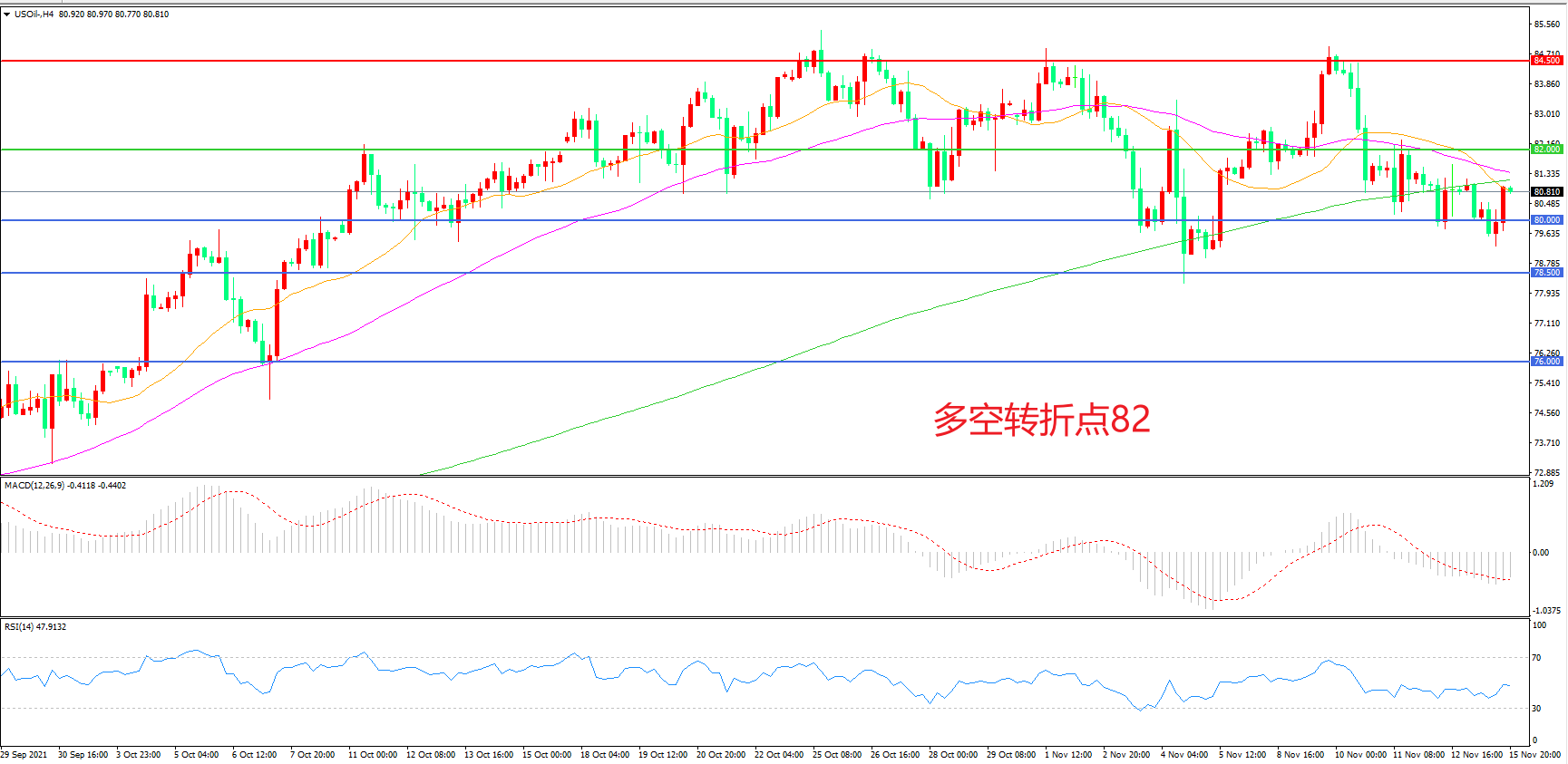 4小时图看,油价受制于均线压力震荡下行,整体表现偏空,82美元成为上方阻力,80美元成为短期支撑,MACD绿柱缩短,RSI指标走平,日内震荡下行概率较大。