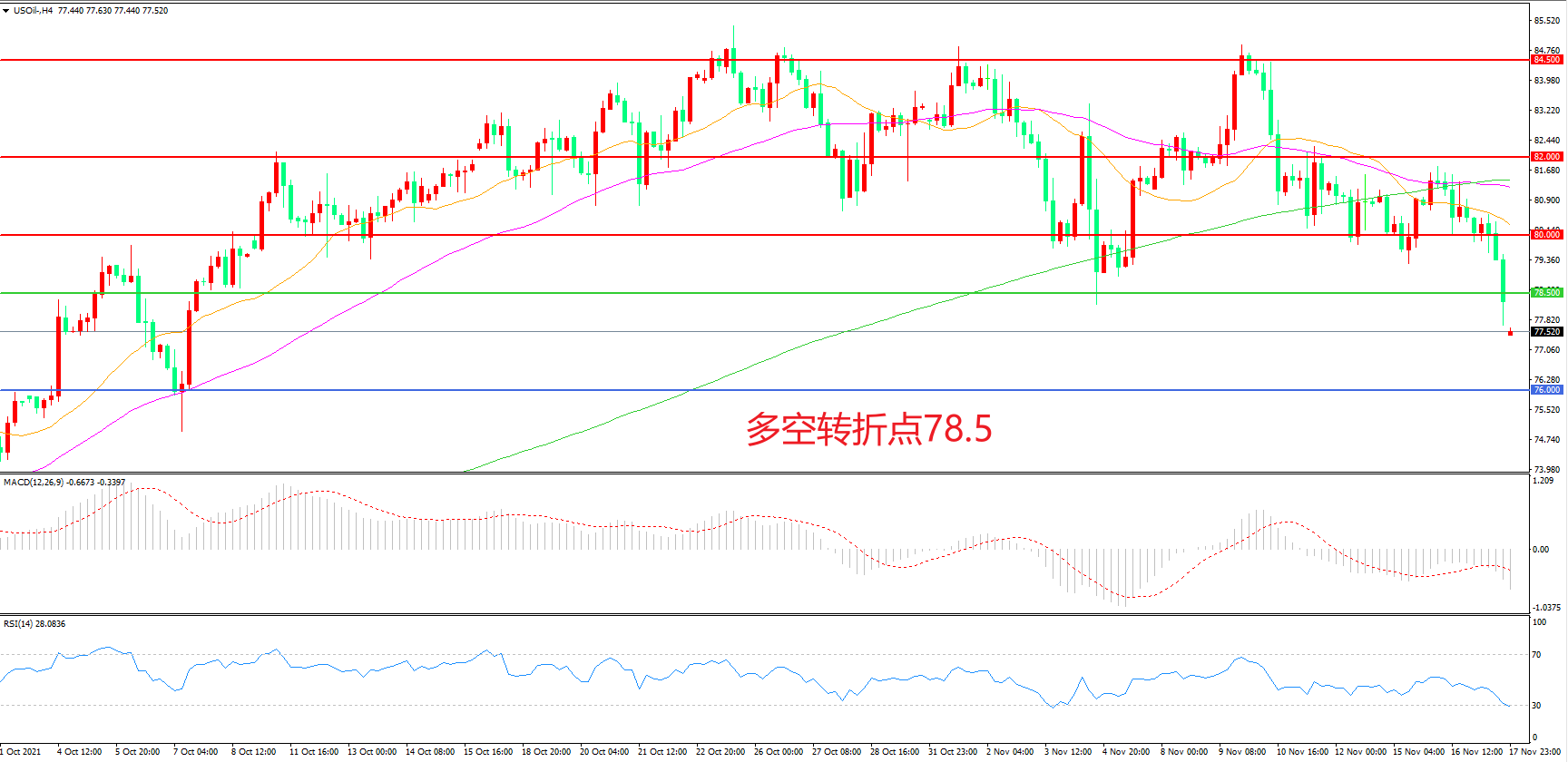 交易策略:在78.50之下看跌,目标76.00               74.00
