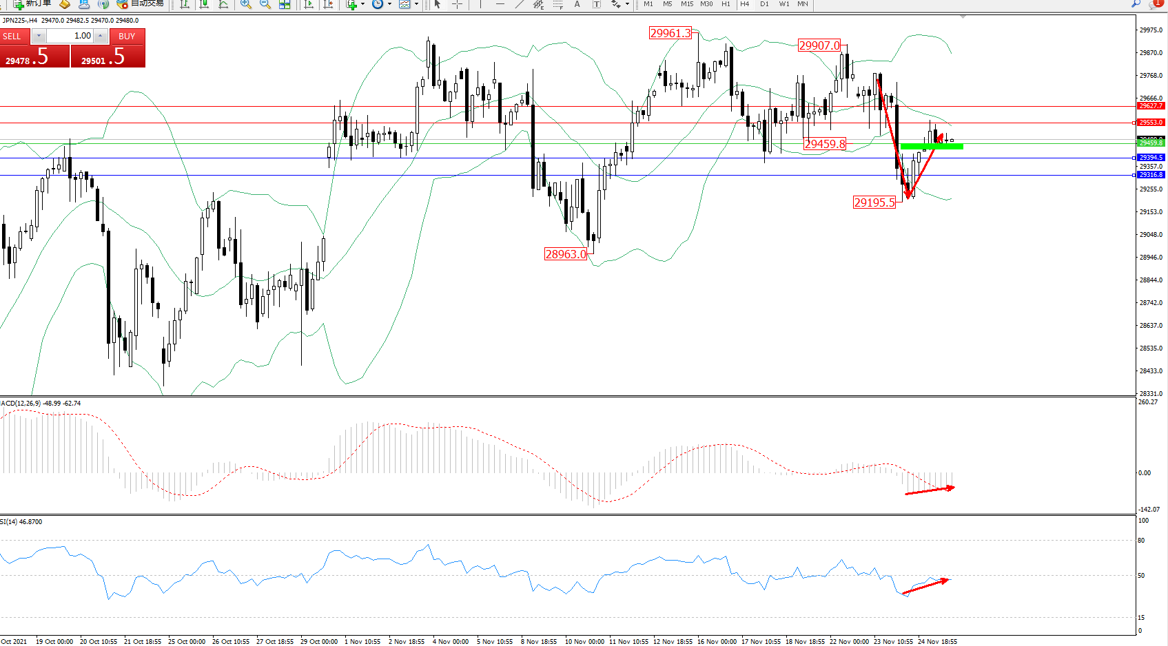 技术点评:高位空头动力急速震荡下行,低位抵达29195位置得到支撑后反转上扬,纠结于布林带指标中轨下方弱势震荡,布林带指标呈张口走势后开始收口整理,短期或维持在中轨附近震荡,MACD指标处于0轴线下方空头区域弱势整理平移,RSI指标空头区域低位多头动力弱势上移至50均衡线下侧弱势徘徊中;