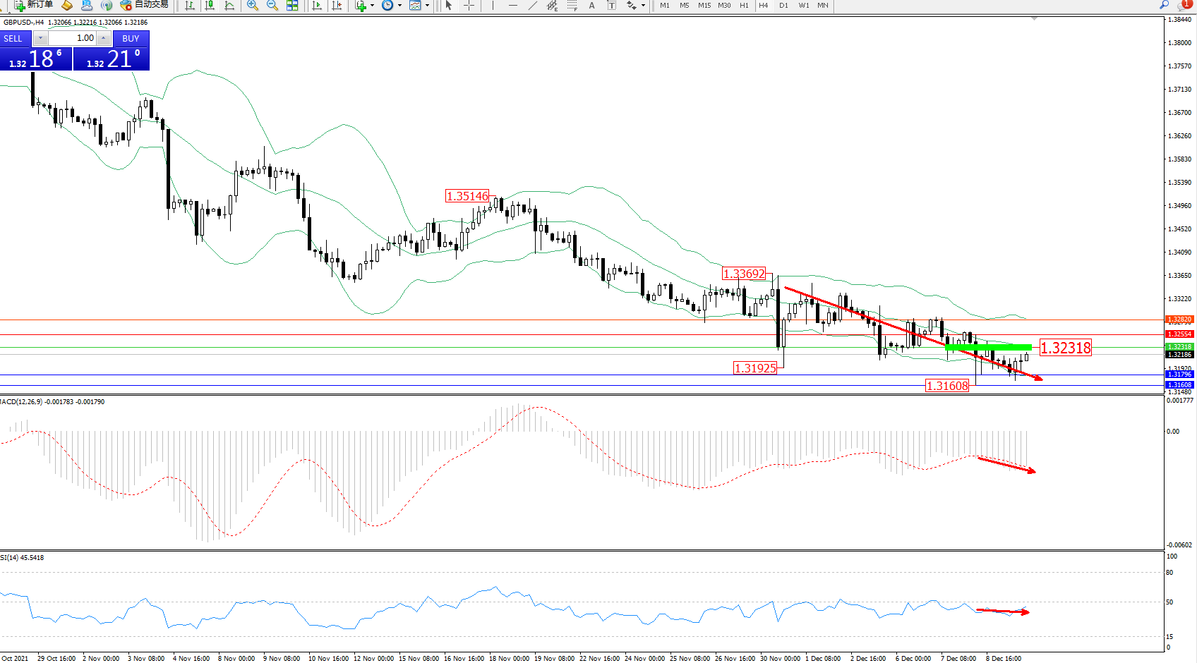 交易策略:1.32318下方看跌,目标1.31796、1.31608