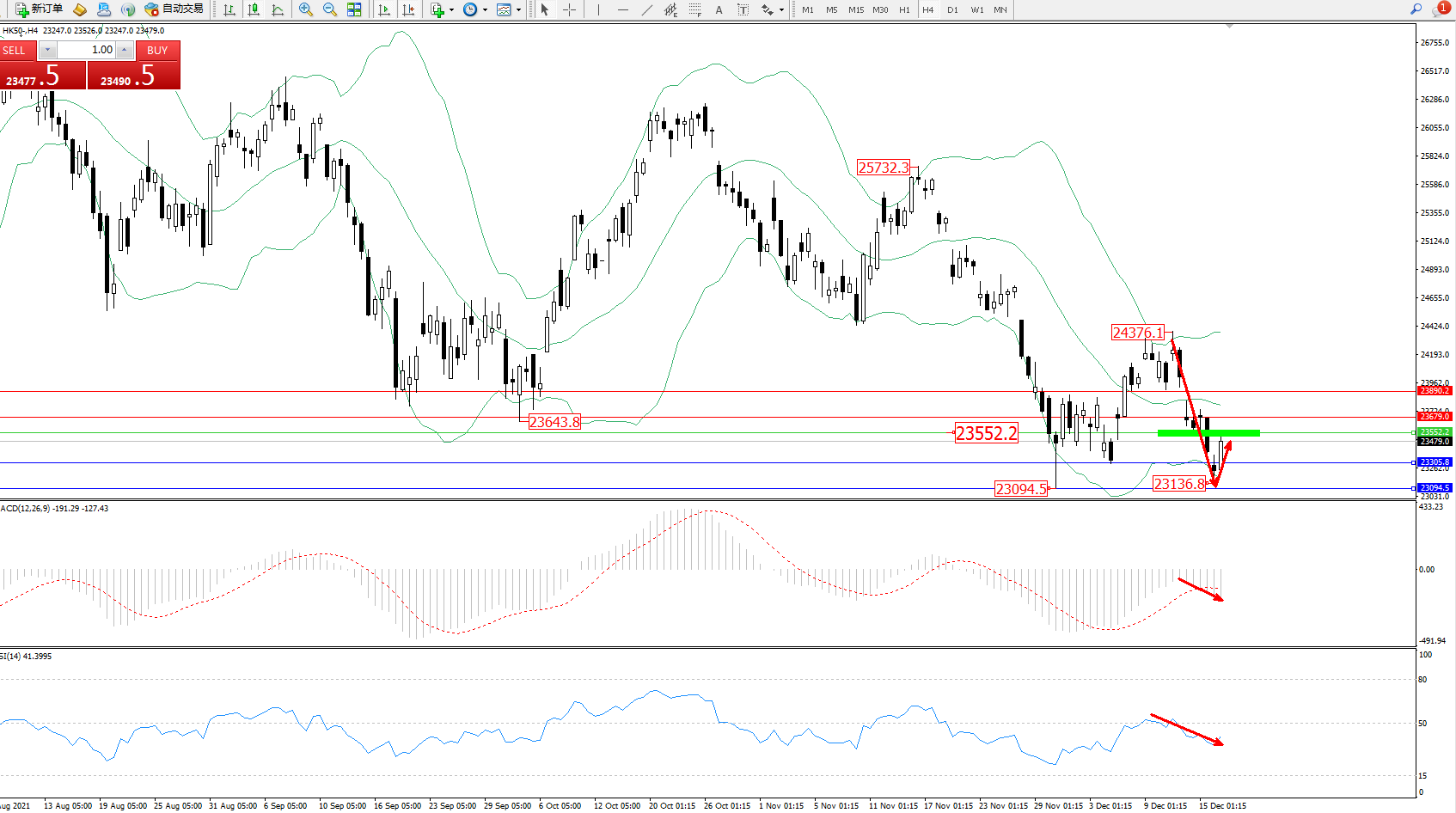 恒指HK50 ——4小时K线图显示: