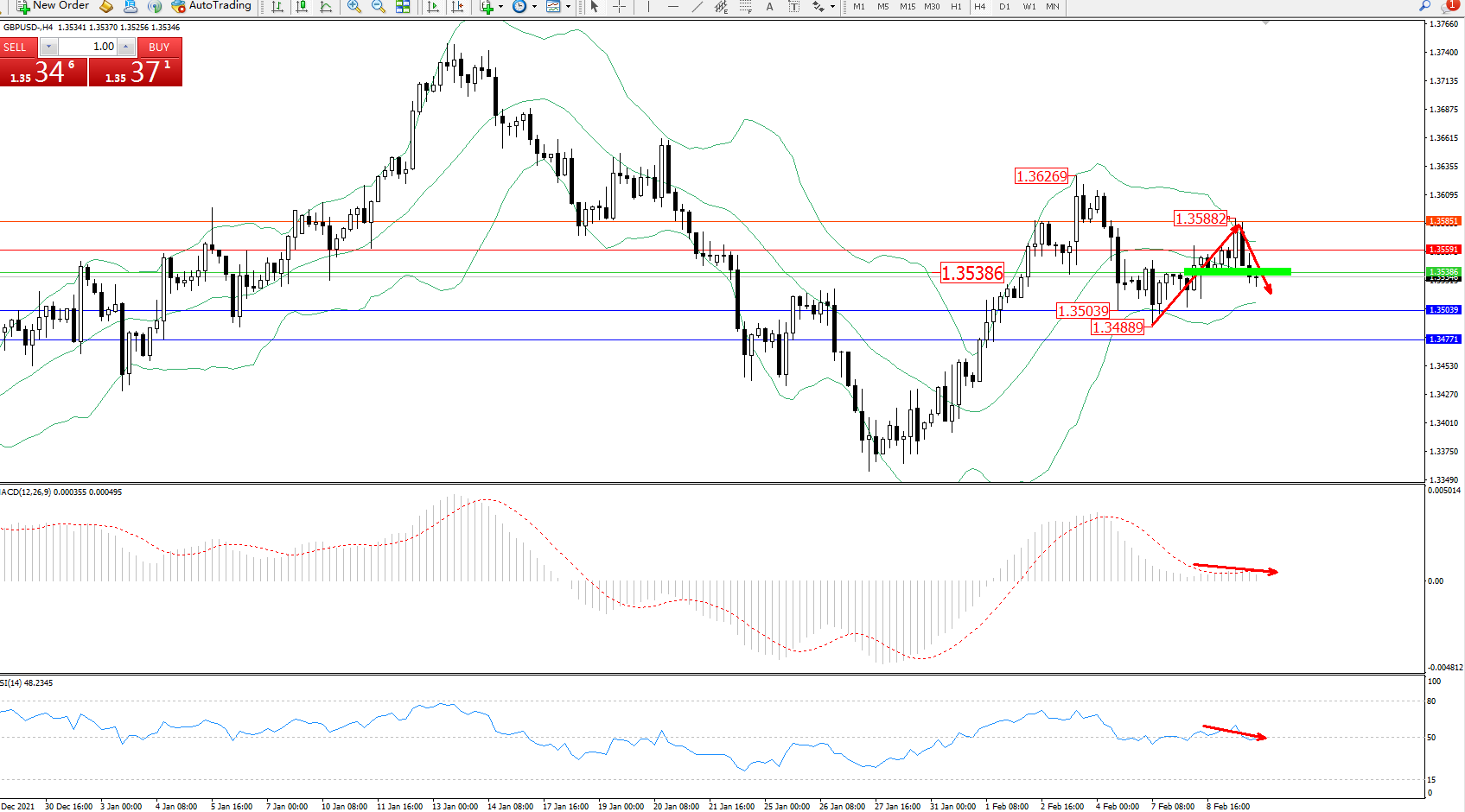交易策略:1.35386下方看跌,目标1.35039、1.34771