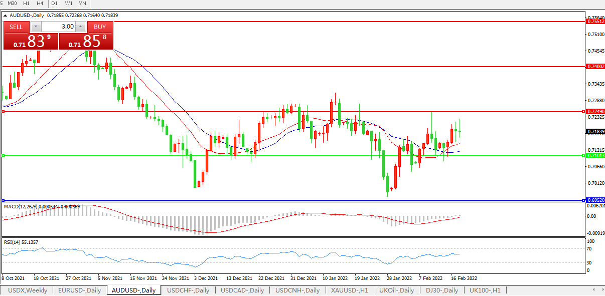 交易策略:0.7100上方看涨,目标0.7250、0.7400