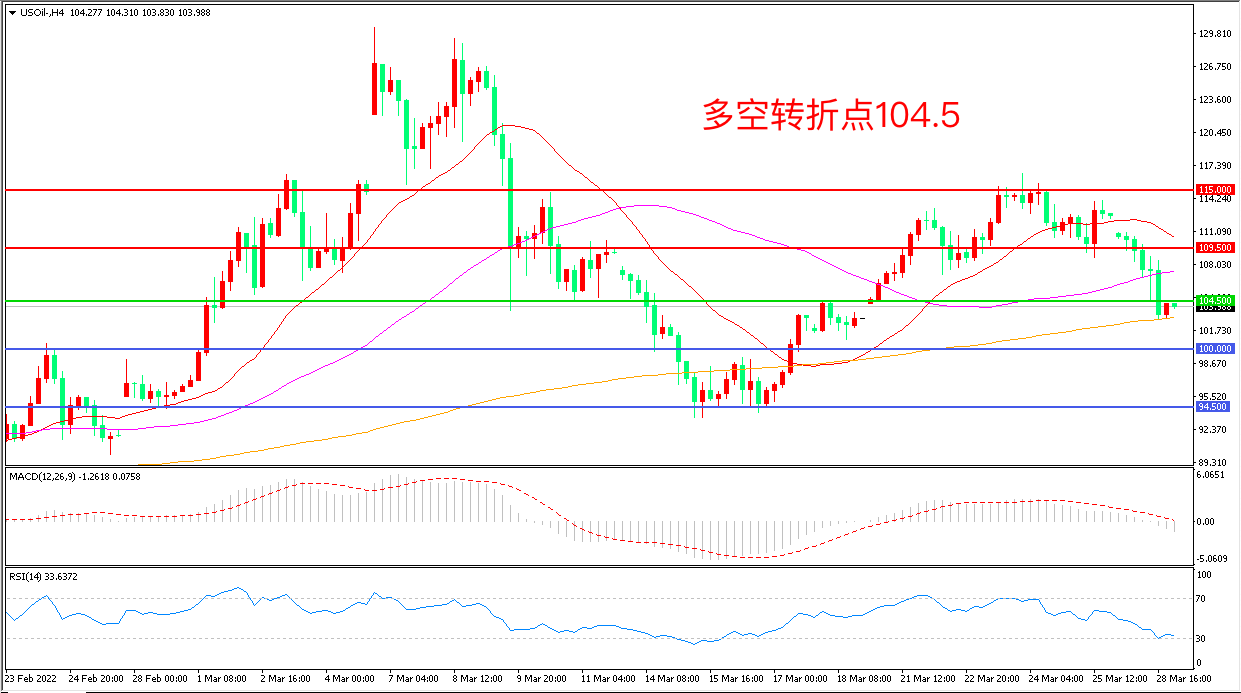 周一(3月29日),《金融时报》报道称,据了解,俄罗斯不再要求乌克兰“去纳粹化”,如果乌克兰在军事上保持不结盟,准备允许乌克兰加入欧盟,俄乌停火的曙光导致投资者抛售原油,美国WTI原油重挫逾7%,收报103.84美元/桶。本周,OPEC+将再度召开部长级会议讨论增产计划,油价近期波幅将会明显放大。